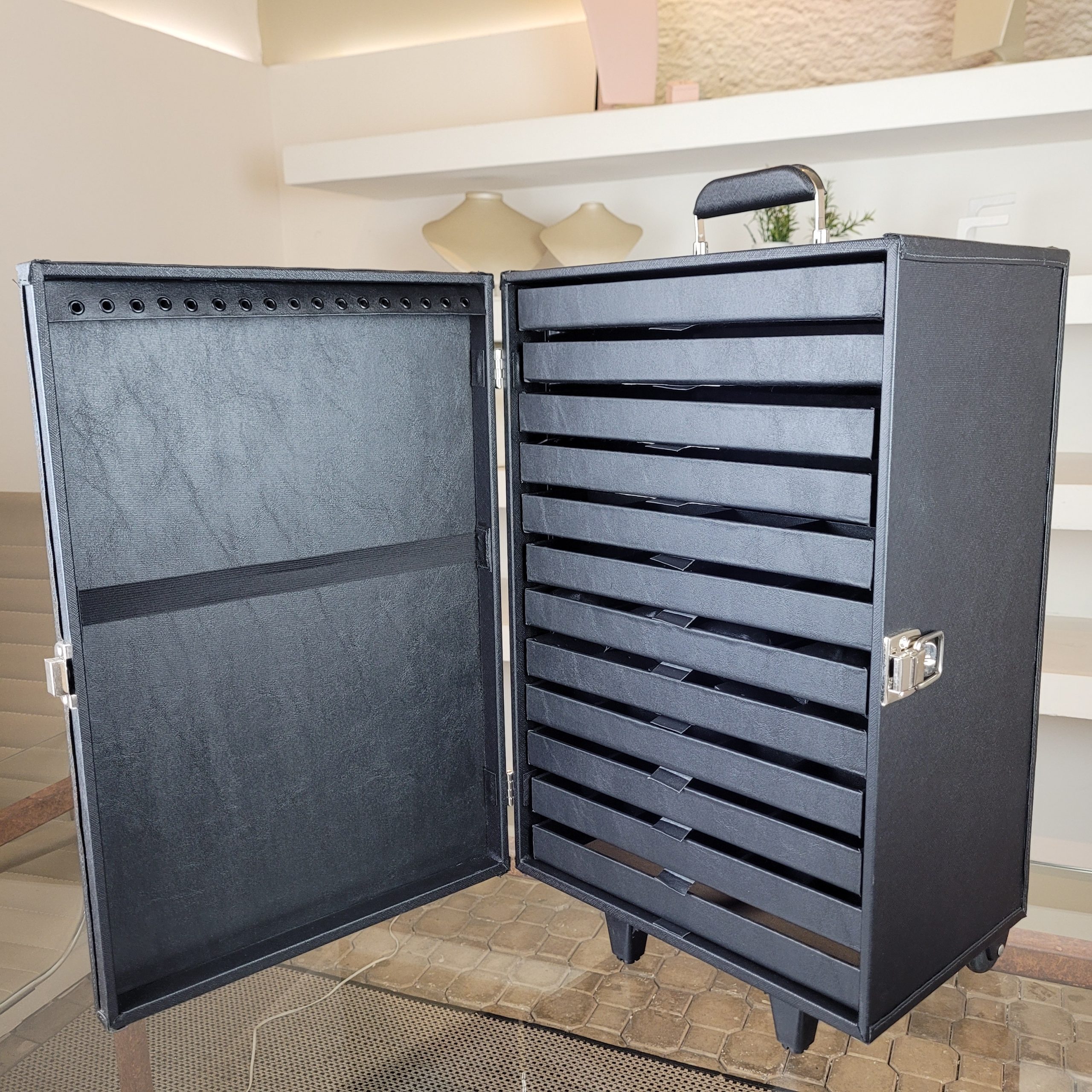 Pensando numa mudança de conceitos e trazendo inovação para apresentação e acondicionamento de joias, semijoias e relógios, a empresa desenvolve e fabrica uma ampla linha de bandejas, malas, bolsas, estojos e expositores de vitrine.